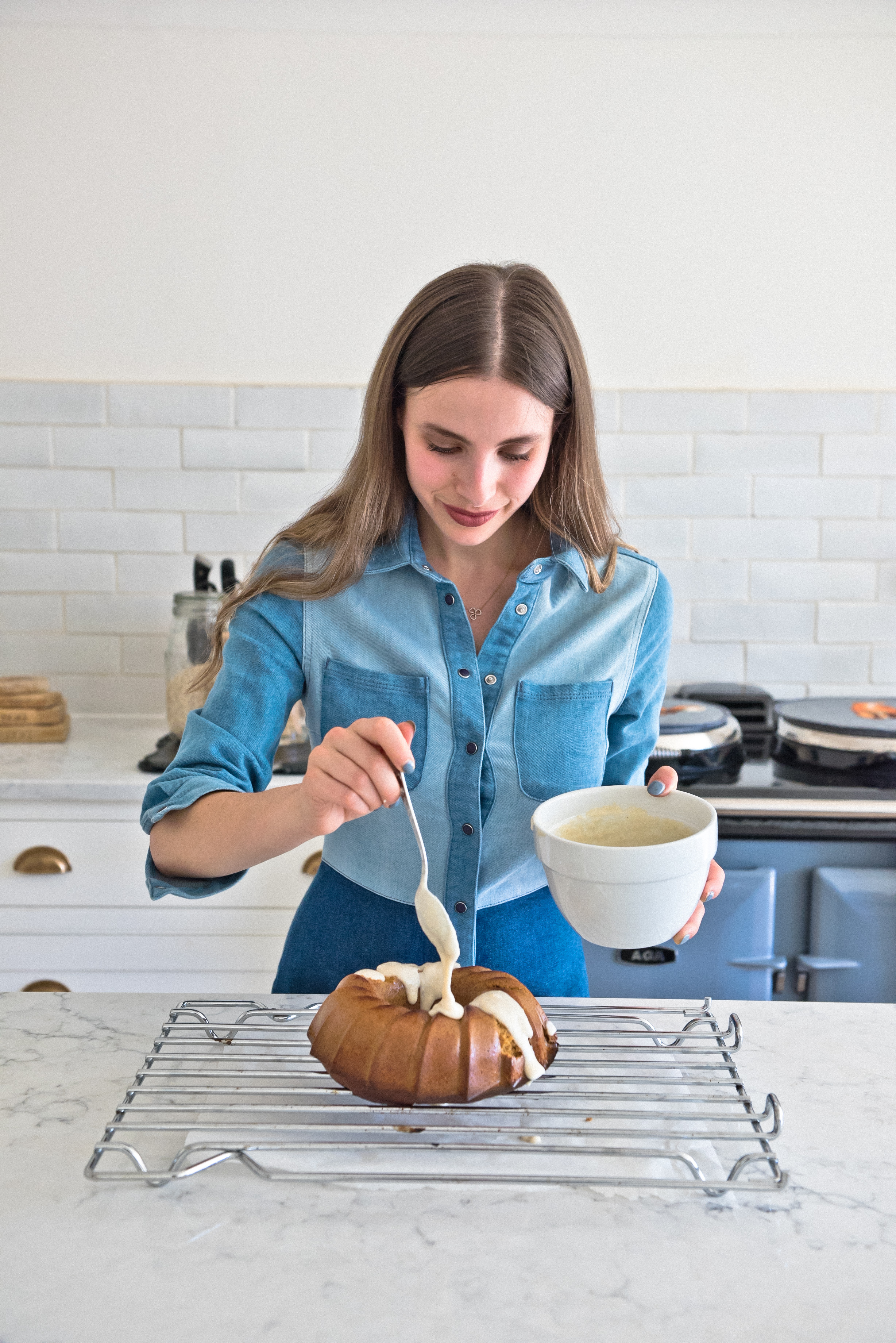 Step 4: Pour the mixture into a silicone bundt cake mold, and place the bottom of the mold on a baking tray before placing in the AGA to cook for 45-50 minutes.